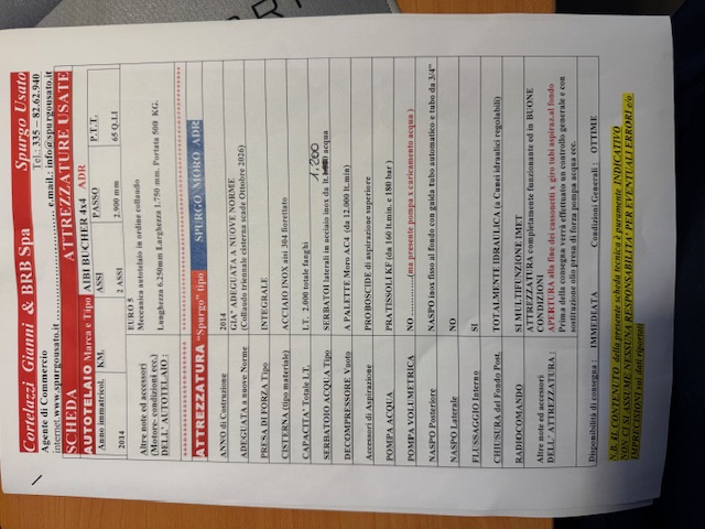 | Note | ATTREZZATURA completamente funzionante ed in BUONE CONDIZIONI. Apertura alla fine dei cassonetti per giro tubi di aspirazione al fondo. Prima della consegna verrà effettuato un controllo generale e con sostituzione dell'olio della presa di forza, pompa acqua ecc. |